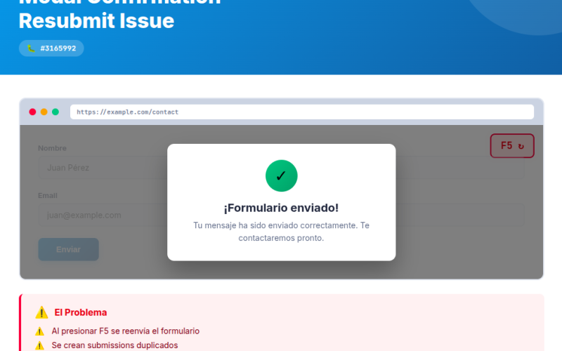 Si has trabajado con Drupal Webform y configurado la confirmación como Modal, probablemente te hayas encontrado con un problema de reenvío: cuando el usuario presiona F5 o refresca la página después de enviar el formulario, se crea un nuevo submission. Este problema de resubmit en Webform con confirmación Modal puede generar duplicados y afectar la integridad de tus datos.