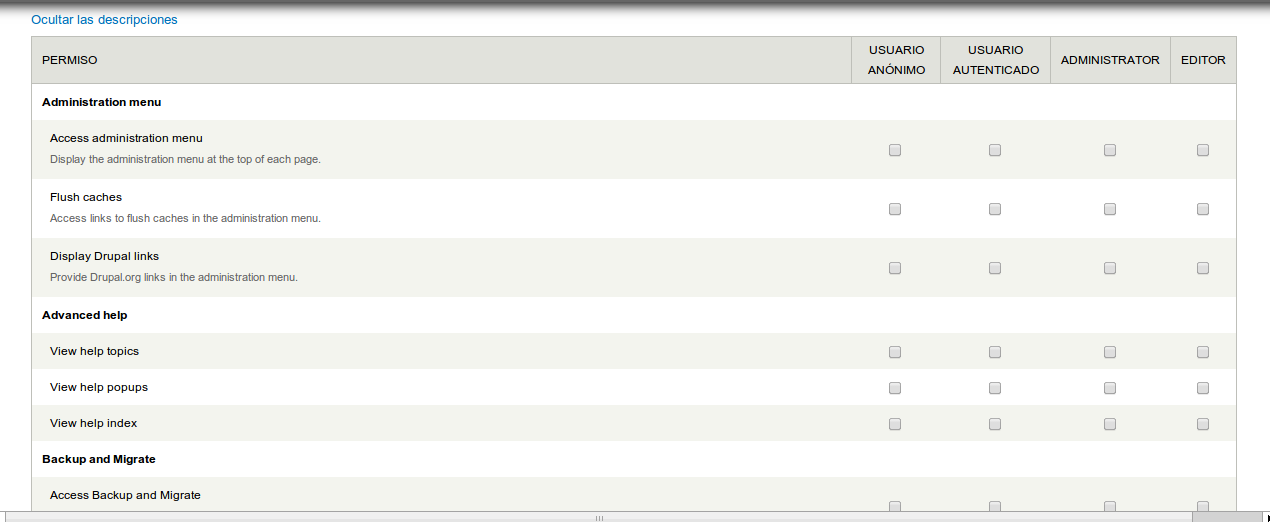 En esta interfaz de administración de permisos por rol encontramos tanto los permisos que vienen con los módulos del core de drupal como de los módulos contribuidos que se han instalado.
